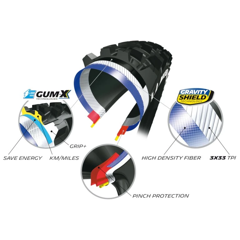 Le composé E-GUM-X offre une adhérence supplémentaire et réduit efficacement la résistance au roulement. De plus, le profil assure une meilleure adhérence. Grâce à la carcasse robuste Gravity Shield, le pneu est adapté à une utilisation intensive en enduro. Un renforcement Pinch Protection sur le talon rigidifie le pneu et réduit les effets de l’écrasement par les chocs. En outre, il dispose d’une couche de protection anti-crevaison extra-robuste qui est appliquée sur toute la carcasse du pneu. Le pneu est tubeless-ready et peut être utilisé sans chambre à air interne, ce qui garantit une adhérence optimale même avec des pressions d’air basses.