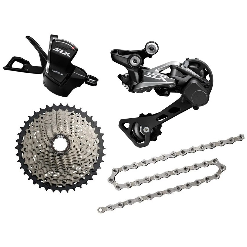 Mise à niveau du Shimano SLX M7000 vers le système d’entraînement à 11 vitesses. Composé du levier de vitesse droit SL-M7000-11-R, du dérailleur arrière mi-long RD-M7000-11-GS, de la cassette CS-M7000 et de la chaîne CN-HG600/601.