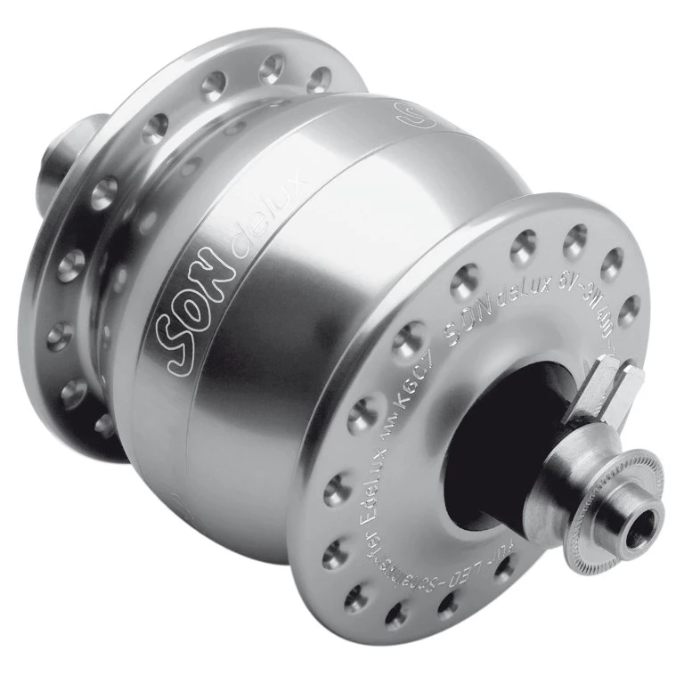 La SON delux est l’une des premières dynamos de moyeu dont l’alternateur est spĂ©cialement conçu pour les projecteurs Ă LED haute performance comme le SON « Edelux ». Contrairement aux ampoules halogènes, une LED est très efficace, mĂŞme et surtout Ă charge partielle. C’est pourquoi il n’est plus nĂ©cessaire de construire la dynamo de manière Ă ce qu’elle atteigne sa pleine puissance dès que la vitesse de dĂ©placement est la plus faible possible. Le SONdelux est donc plus petit et plus lĂ©ger qu’une dynamo de moyeu selon la norme allemande. Lorsque les phares sont allumĂ©s, le SONdelux Ă©conomise environ 1 watt de puissance motrice.